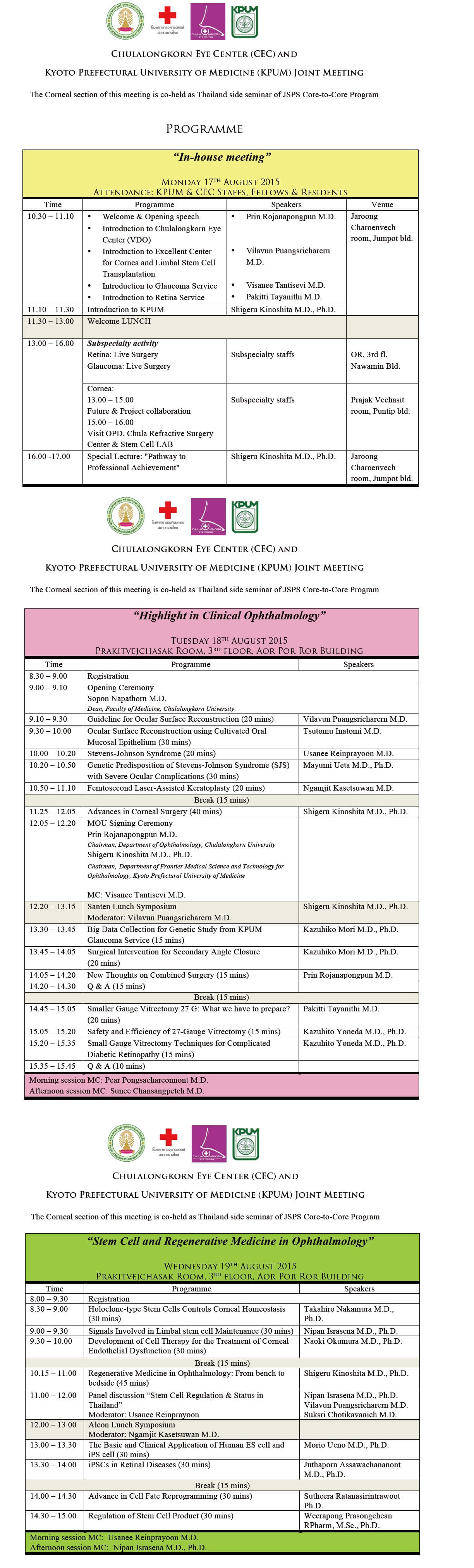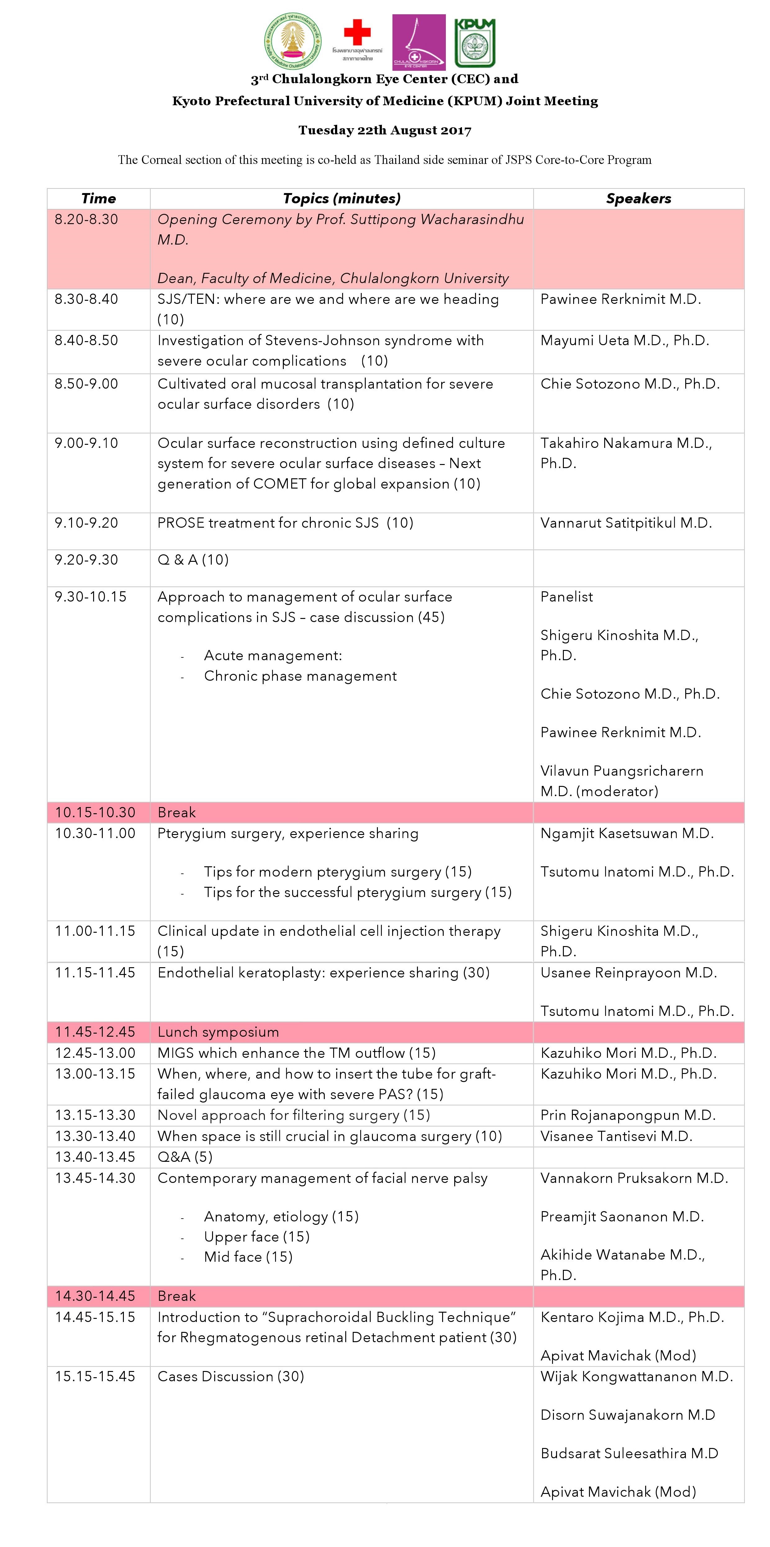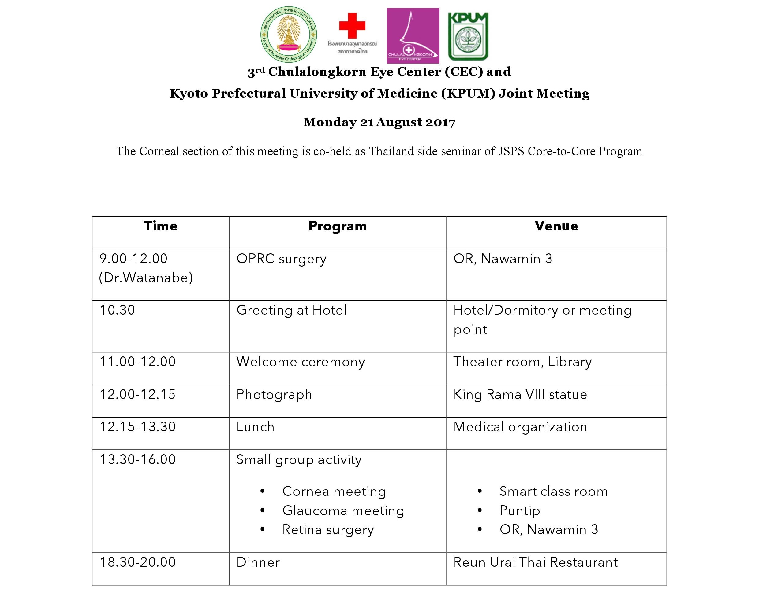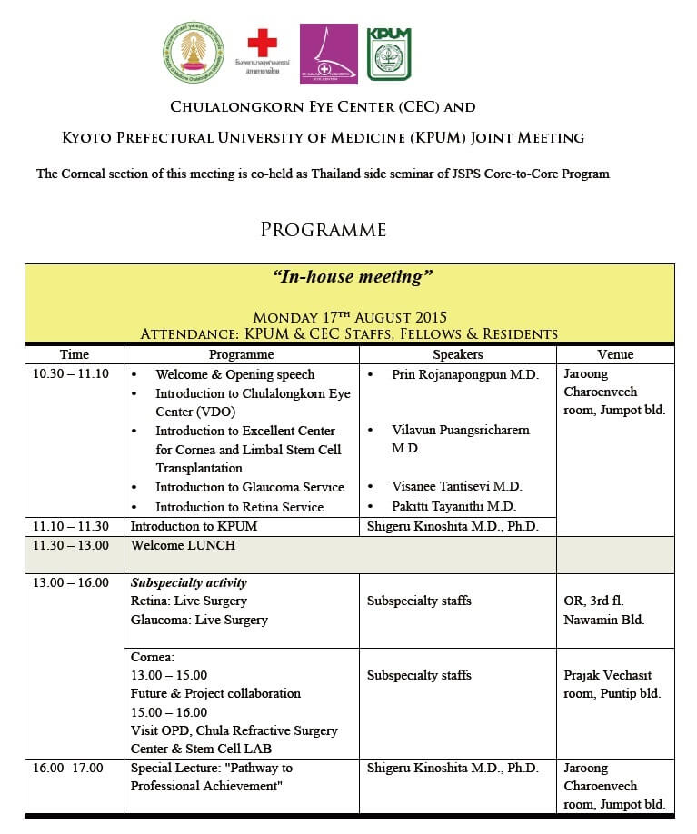 JSPS Core-to-Core Program “Chulalongkom Eye Center ? Kyoto Prefectural University of Medicine” (The Corneal section of this meeting is co-held as Thailand side seminar of JSPS Core-to-Core Program)日本学術振興会研究拠点形成事業「チュラーロンコーンアイセンター・京都府立医科大学共同ミーティング」
