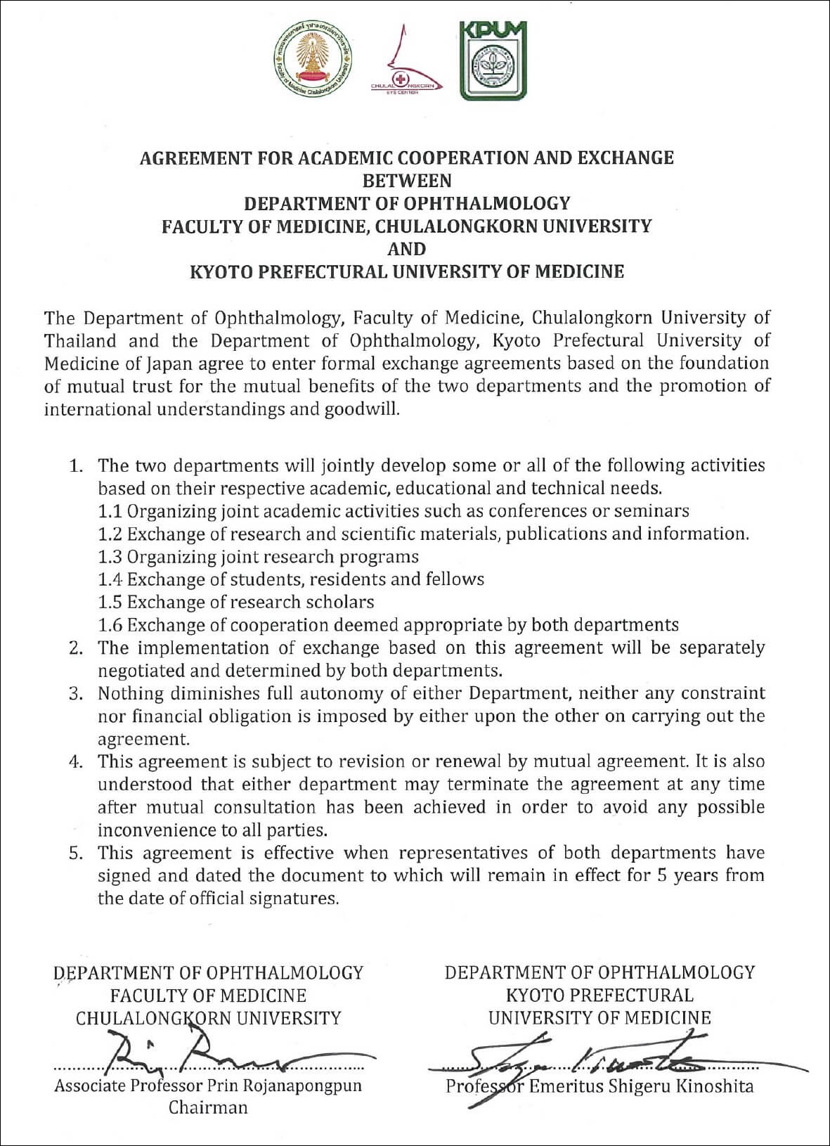 2日目は、“Highlight in Clinical Ophthalmology ” symposiumが開催され、Chulalongkorn大学から5名が発表、京都府立医科大学から5名が発表しました。 さらに、Chulalongkorn大学と京都府立医科大学間の交流についてMemorandum of Understanding(了解覚書)を交わしました。