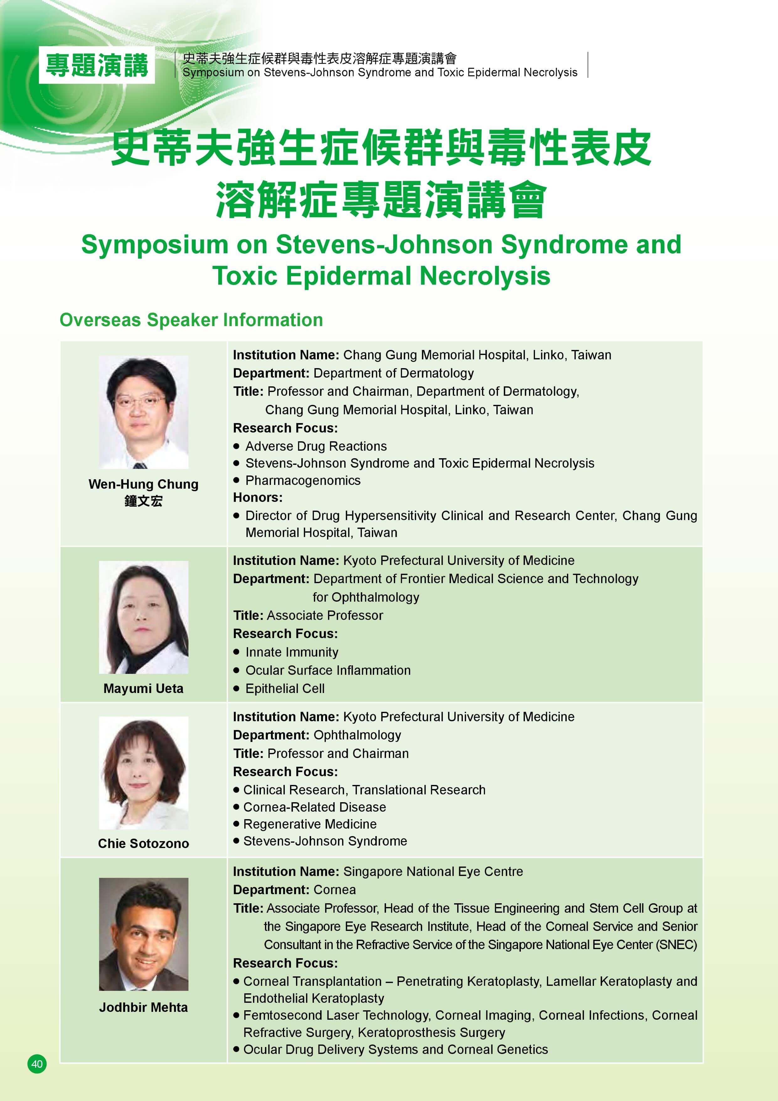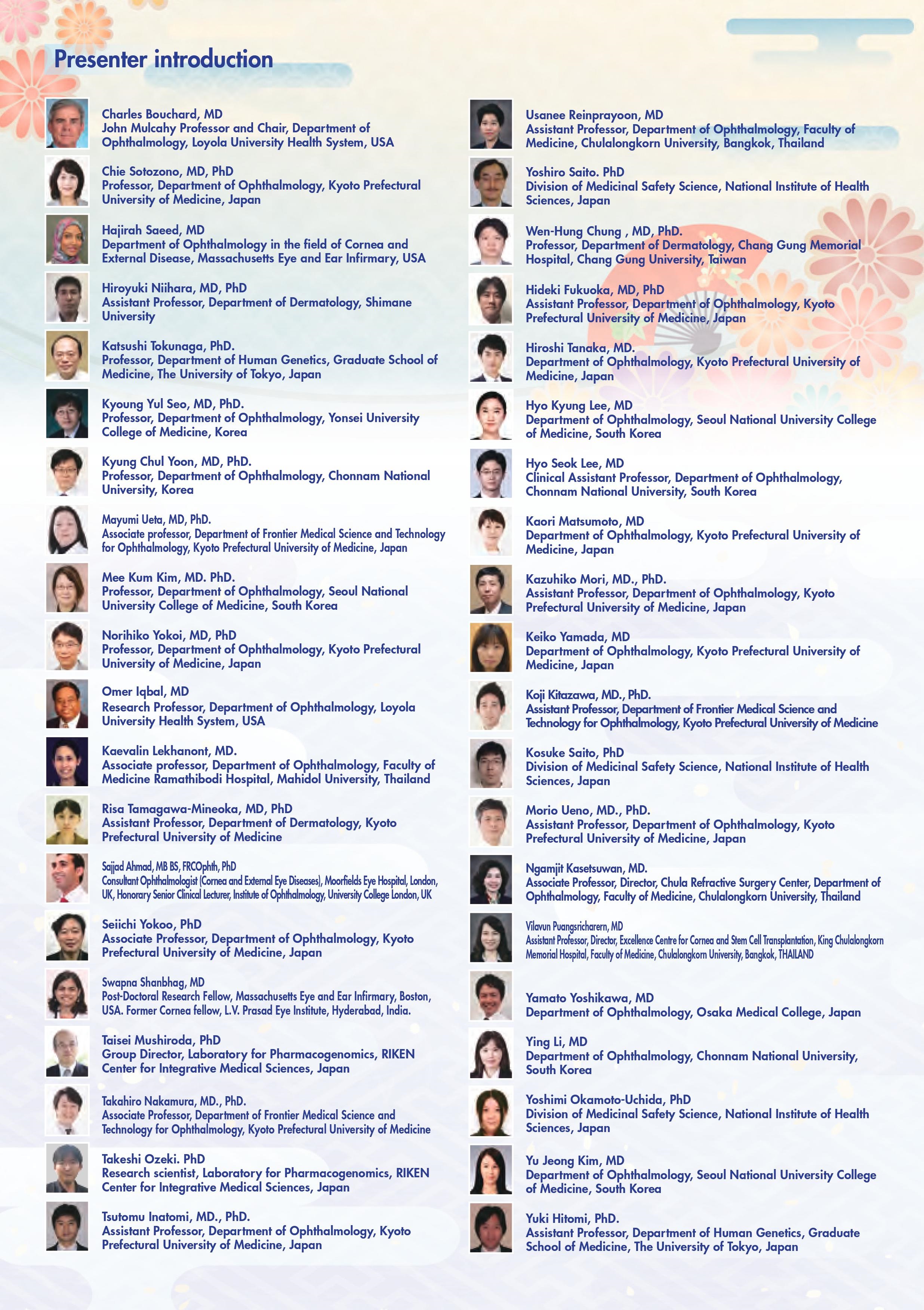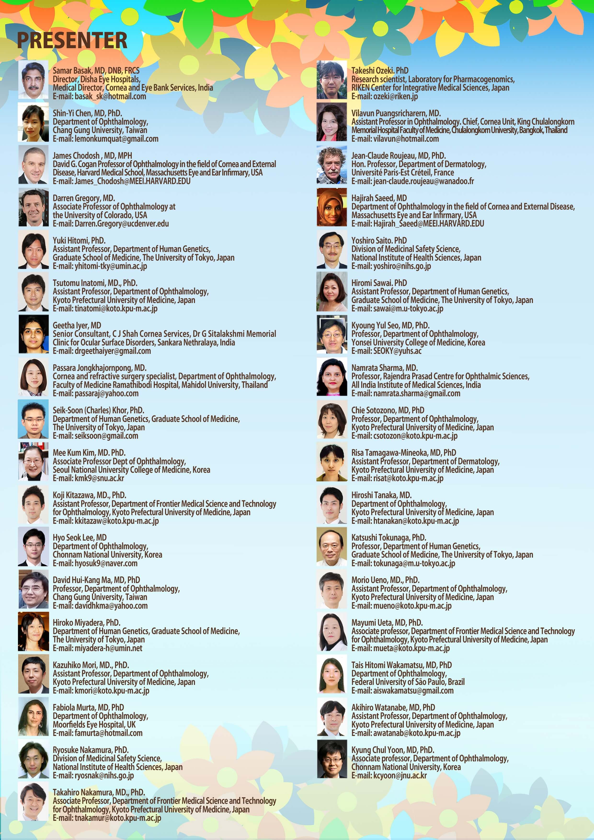 本シンポジウムには、米国、英国、カナダ、インド、韓国、台湾、タイなどの海外から25名を超える臨床医と研究者が集い、日本からは、多数の眼科臨床医、皮膚科臨床医、ゲノム研究者、ならびに、免疫学者が参加し、難治性眼疾患であるStevens-Johnson症候群の診断と治療の標準化、遺伝素因と疾患病態について発表ならびに討論を行いました。