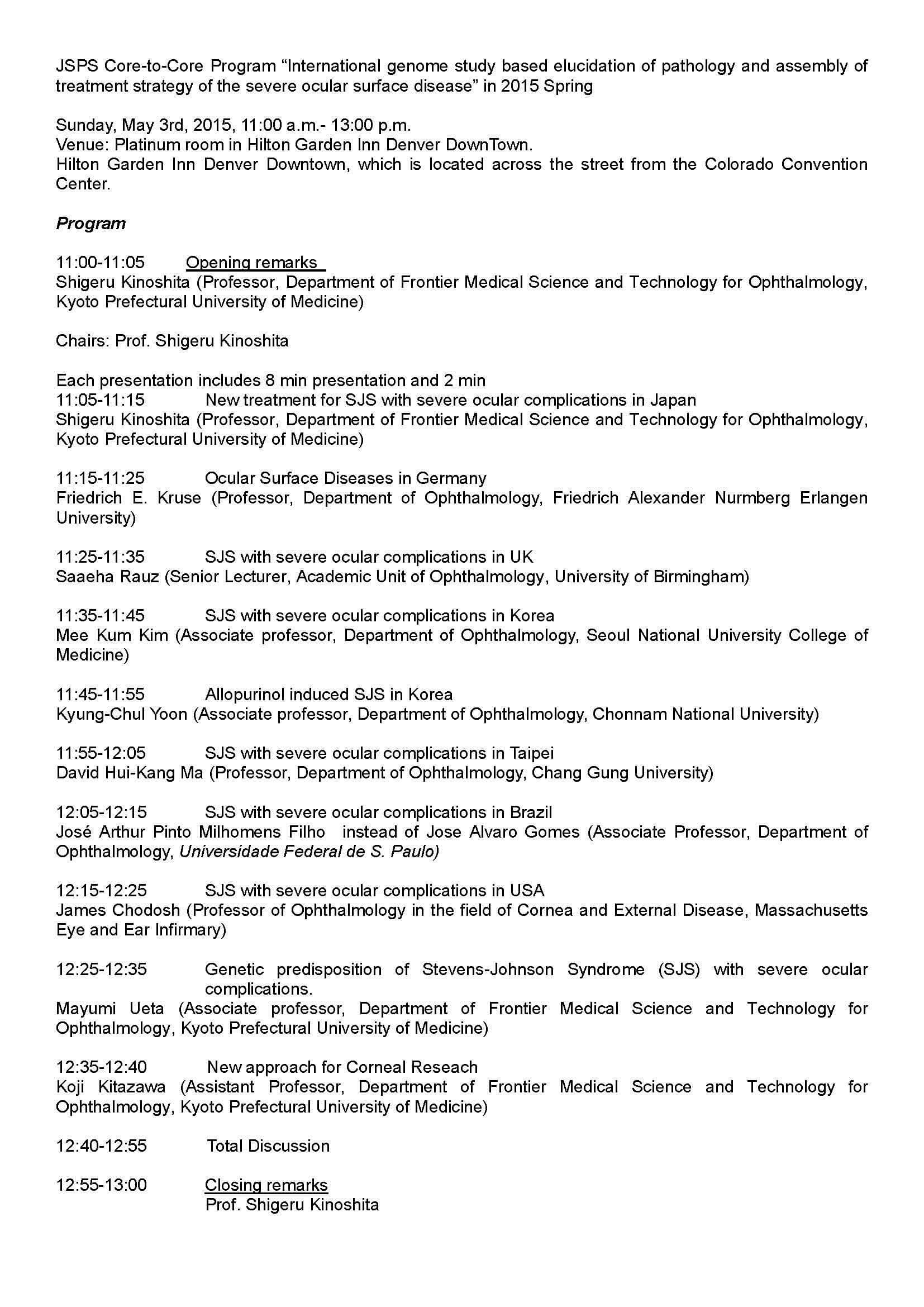 2015年5月3日に、アメリカ、デンバーにて、第1回JSPS Core-to-Core Program セミナー (JSPS Core-to-Core Program “International genome study based elucidation of pathology and assembly of treatment strategy of the severe ocular surface disease “ in 2015 Spring)を開催し、各共同研究相手国(ドイツ7名、英国1名、韓国6名、台湾4名、ブラジル1名 、アメリカ3名、インド1名)ならびに日本から9名の総勢32名が参加し、眼表面疾患の研究について発表ならびに議論を行いました。