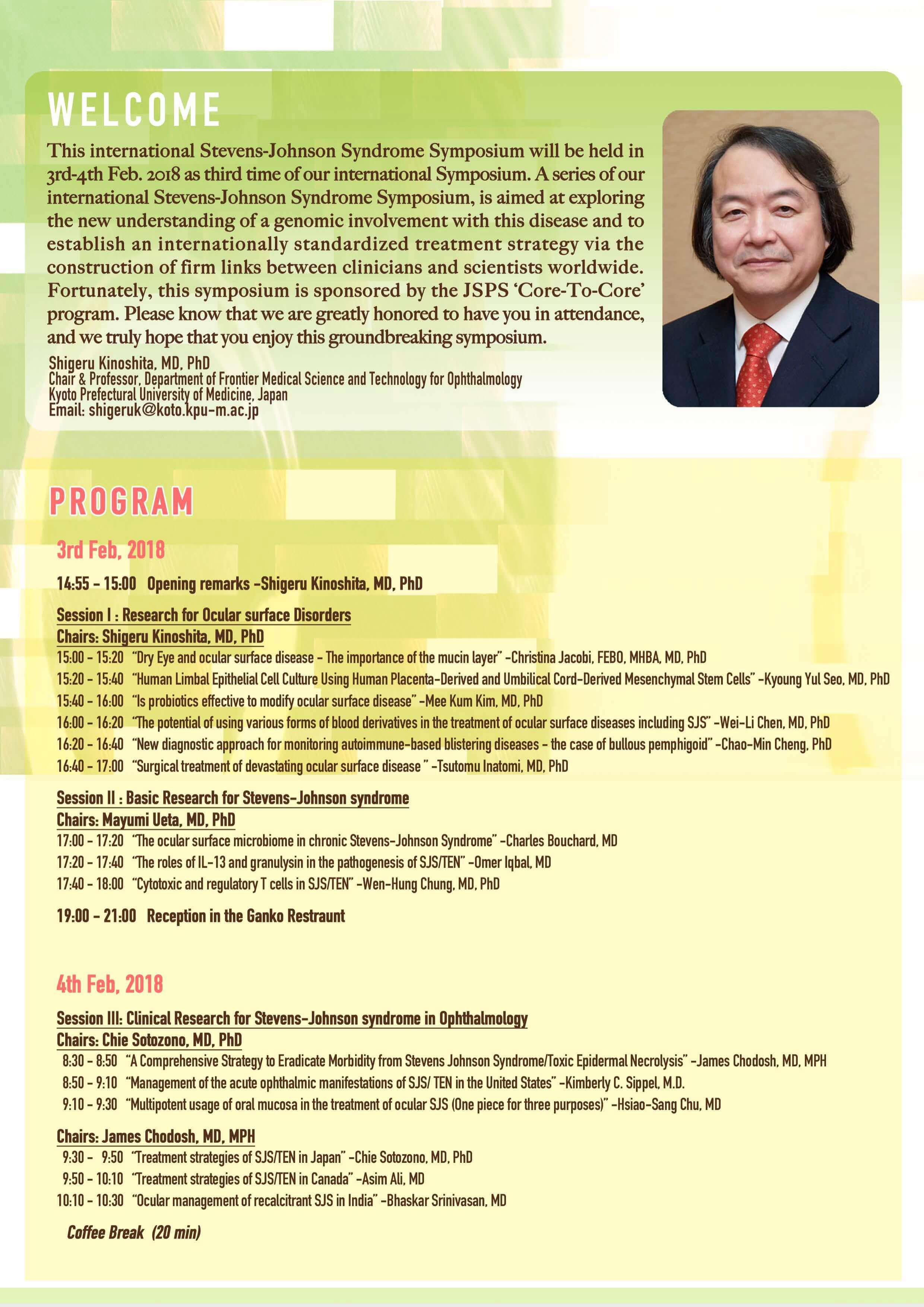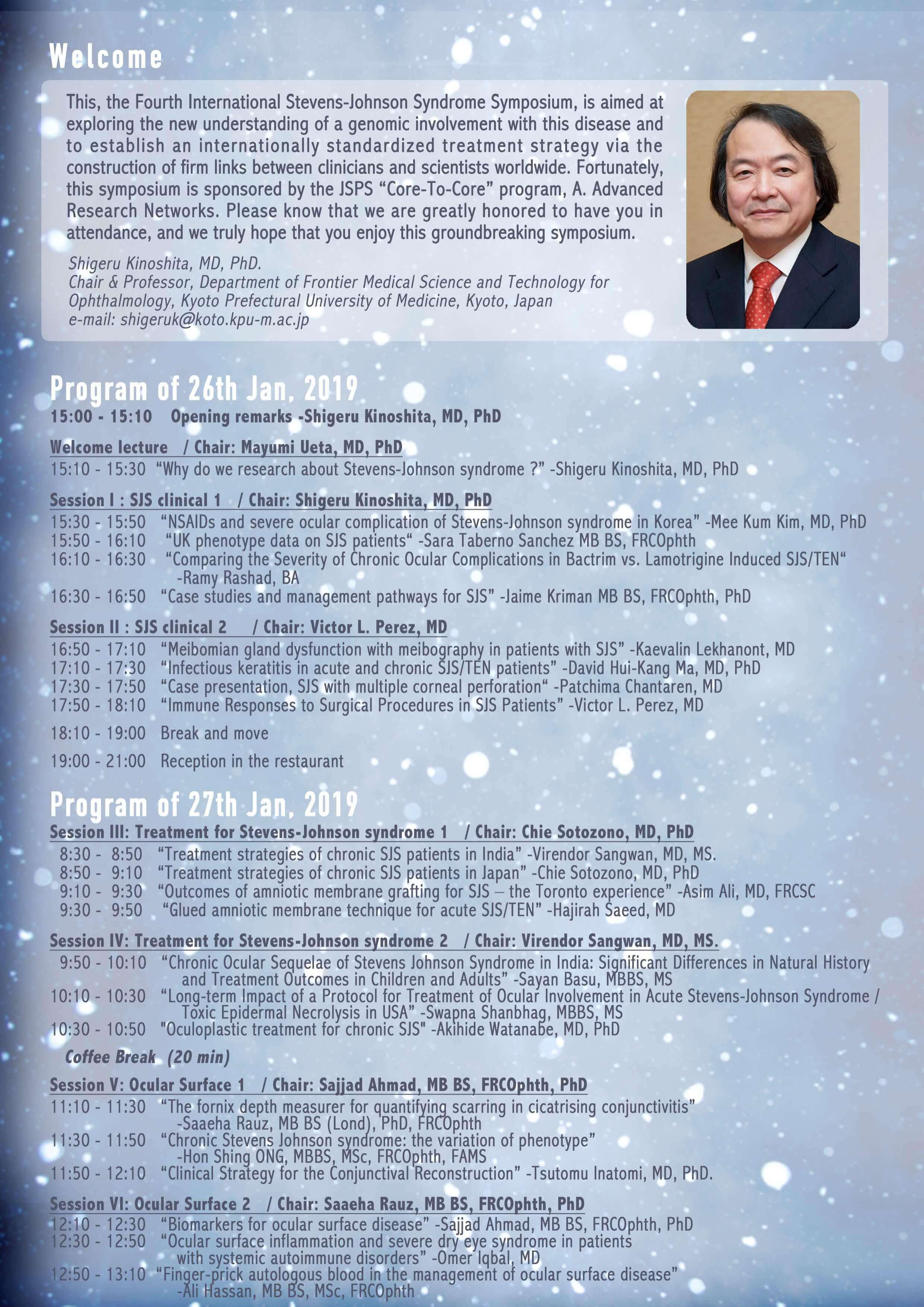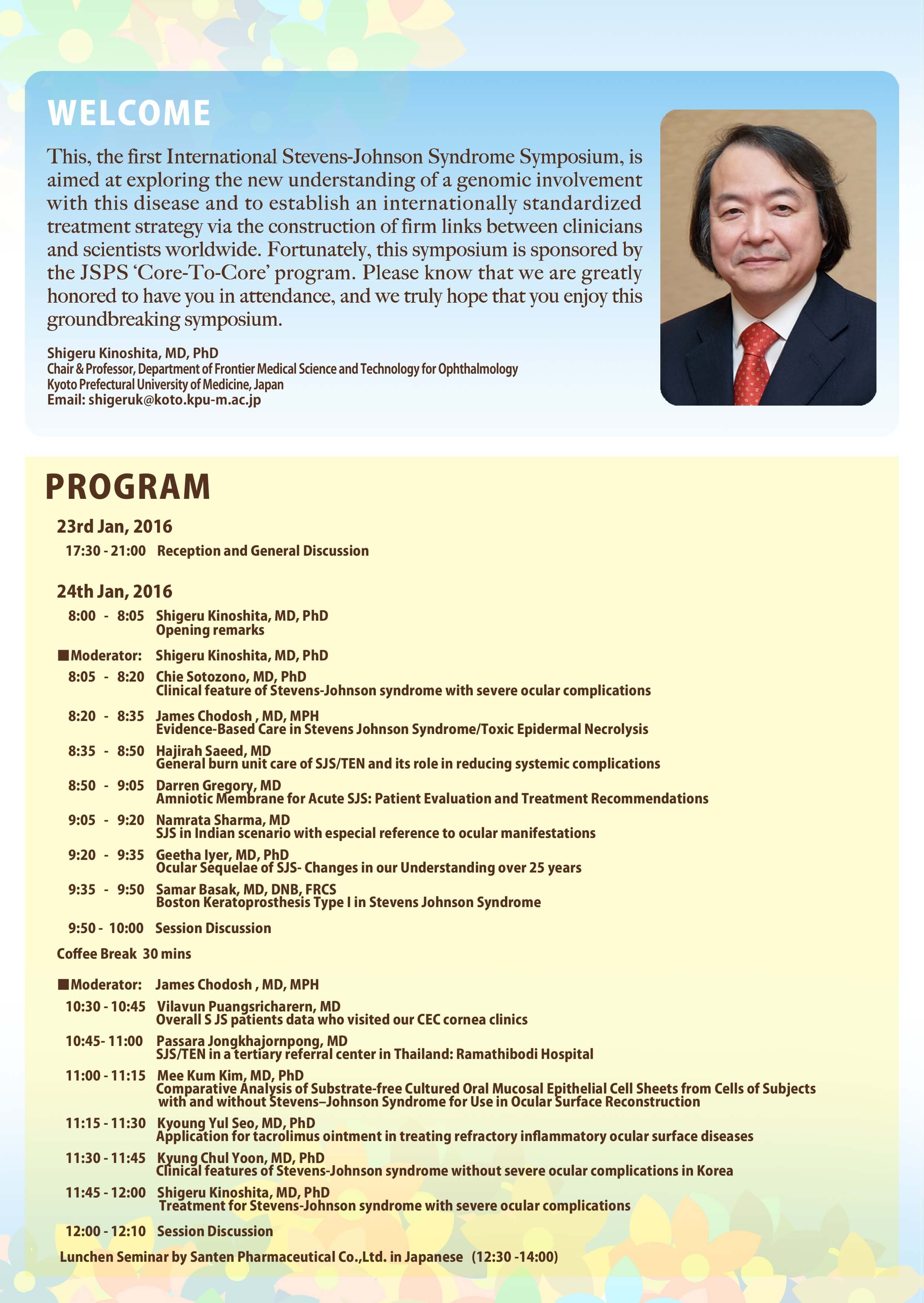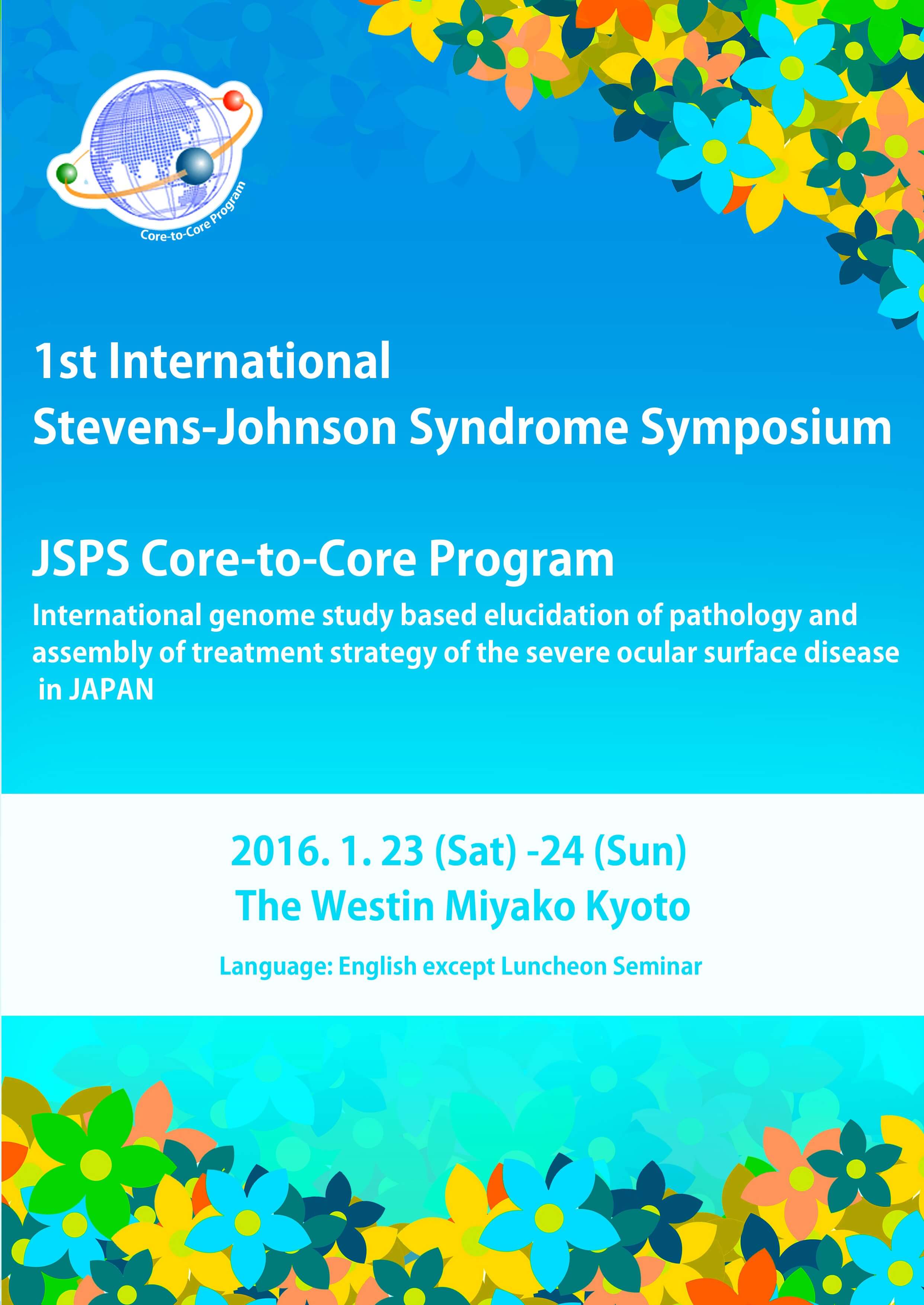 さて、このたび2016年1月24日(日曜日)、ウェスティン都ホテル京都にて、First International Stevens-Johnson Syndrome Symposiumを開催する運びとなりました。本シンポジウムは京都府立医科大学で採択されていますJSPS研究拠点形成事業A.先端拠点形成型(研究期間:平成27年度~平成31年度)の国際シンポジウムとして開催させていただくものです。 Stevens-Johnson症候群は、発症頻度は稀ながら、重篤な視力障害とともに眼後遺症を生じる疾患であり、日本のみならず国際的にも難治性眼表面疾患として憂慮されています。今回は、海外からは、米国、英国、フランス、ブラジル、インド、韓国、台湾、タイなどの約30名の臨床医と研究者が集い、日本からは、共同研究者である第一線のゲノム研究者も参加し、Stevens-Johnson症候群の診断と治療の標準化、遺伝素因と疾患病態について発表ならびに討論を行います。今回、日本がまとめ役となって、Stevens-Johnson症候群についての国際共同研究シンポジウムを実施できることを大変に意義あることと捉え、日本学術振興会ならびに関係各位に感謝しております。