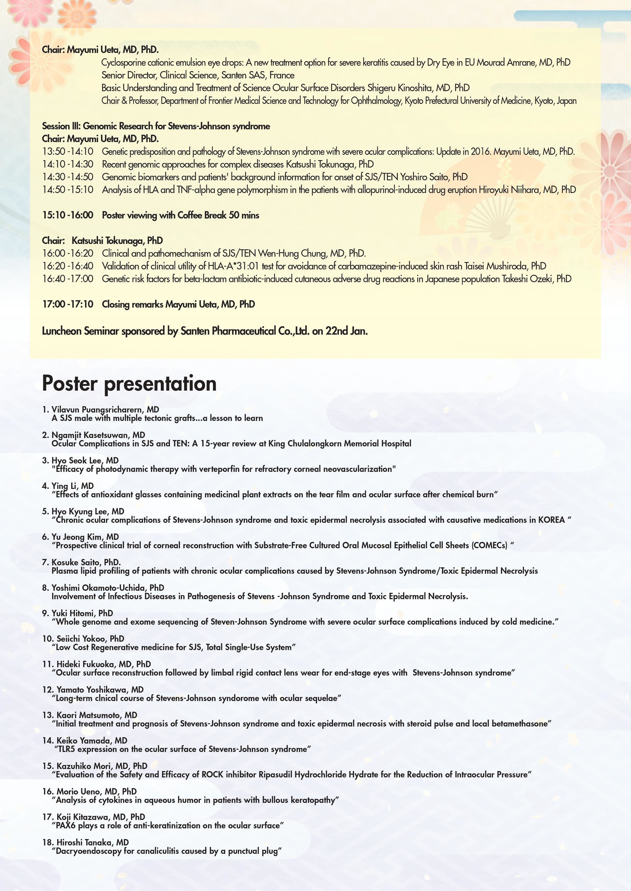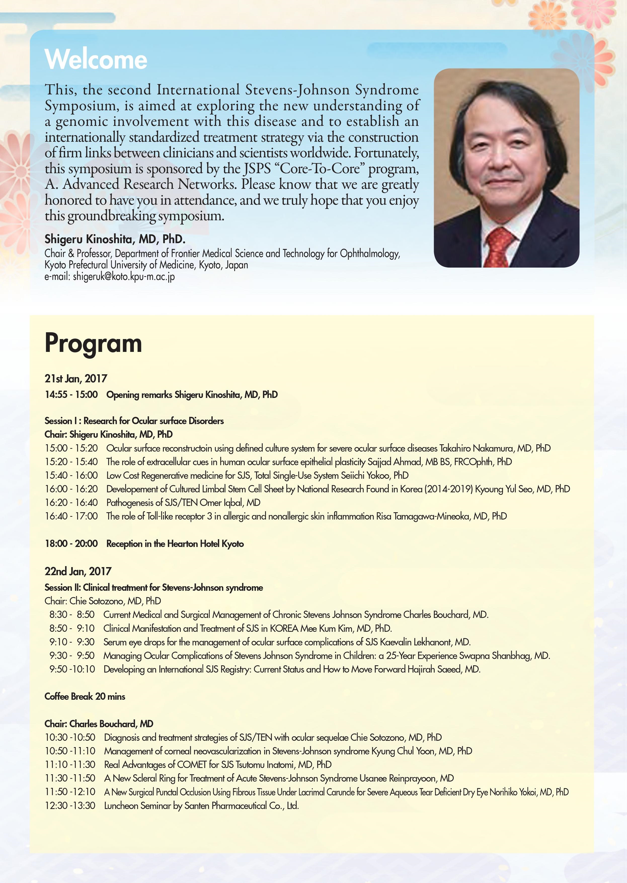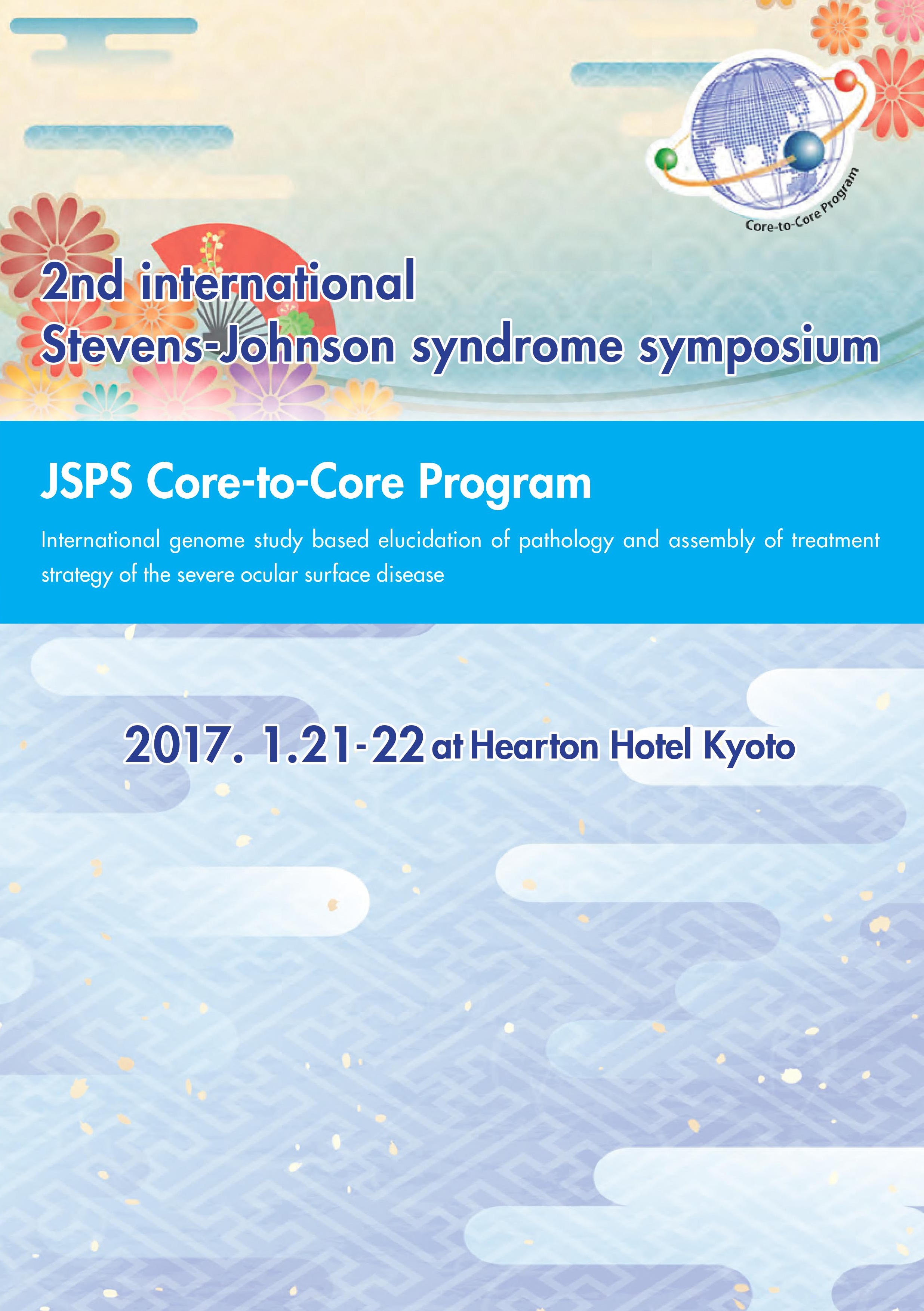 さて、このたび2017年1月21日(土曜日)午後から22日(日曜日)にかけて、ハートンホテル京都にて、Second International Stevens-Johnson Syndrome Symposiumを開催する運びとなりました。本シンポジウムは京都府立医科大学で採択されていますJSPS研究拠点形成事業A.先端拠点形成型(研究期間:平成27年度~平成31年度)の国際シンポジウムとして開催させていただくもので、昨年1月開催の第一回目に引き続き、二回目の開催となります。