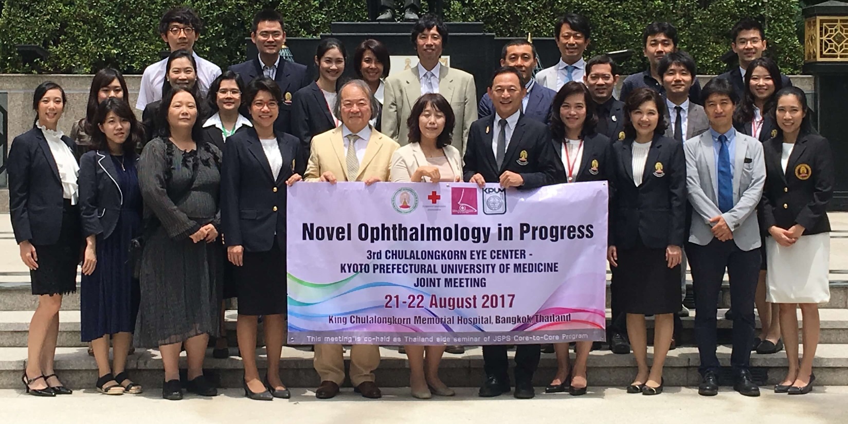 2017.8. 21-22の間、タイのバンコクにあるChulalongkorn大学にて、「第三回チュラーロンコーンアイセンター・京都府立医科大学共同ミーティング」(日本学術振興会研究拠点形成事業のタイ側プログラム)が開催されました。8月21日は、Chulalongkorn大学眼科チームと京都府立医科大学感覚器未来医療学・眼科学チーム(角膜、緑内障、網膜、眼形成領域)との交流が行われました。8月22日は、“Novel Ophthalmology in Progress” symposiumが開催され、Chulalongkorn大学から11名が発表、京都府立医科大学から7名が発表し、その他の参加者は約100名でした。