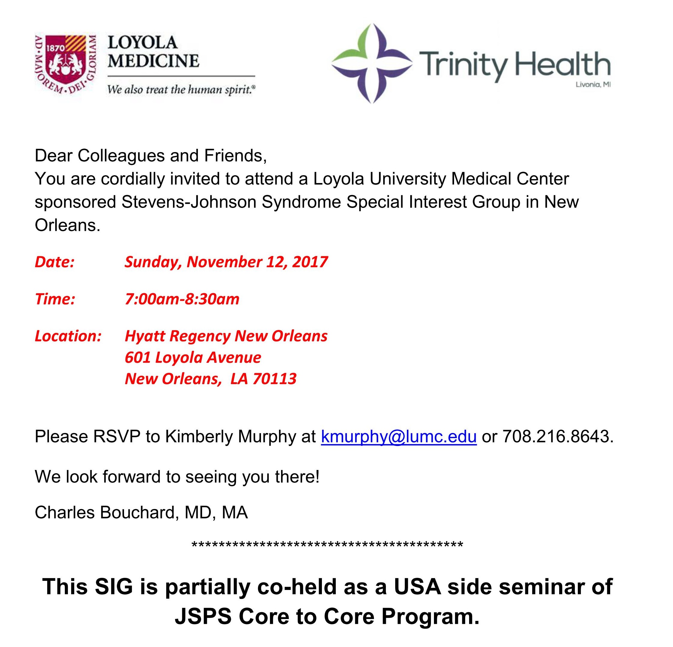 2017年11月12日(日曜日)に、アメリカのニューオーリンズで、アメリカ側共同研究者であるLoyola UniversityのCharles Bouchard教授主催で、第9回 JSPS Core-to-Core Program セミナー“Loyola University Medical Center sponsored Stevens-Johnson Syndrome Special Interest Group in New Orleans” が開催されました。アメリカ側共同研究者6名、日本側JSPS研究者5名に加えて、アメリカとカナダから数人の眼科医が参加し、総勢約20名で、難治性眼新患であるStevens-Johnson症候群の病態、遺伝素因、ならびに、治療する上での臨床上の問題点等について、提示ならびにその解決方法について議論を行った。