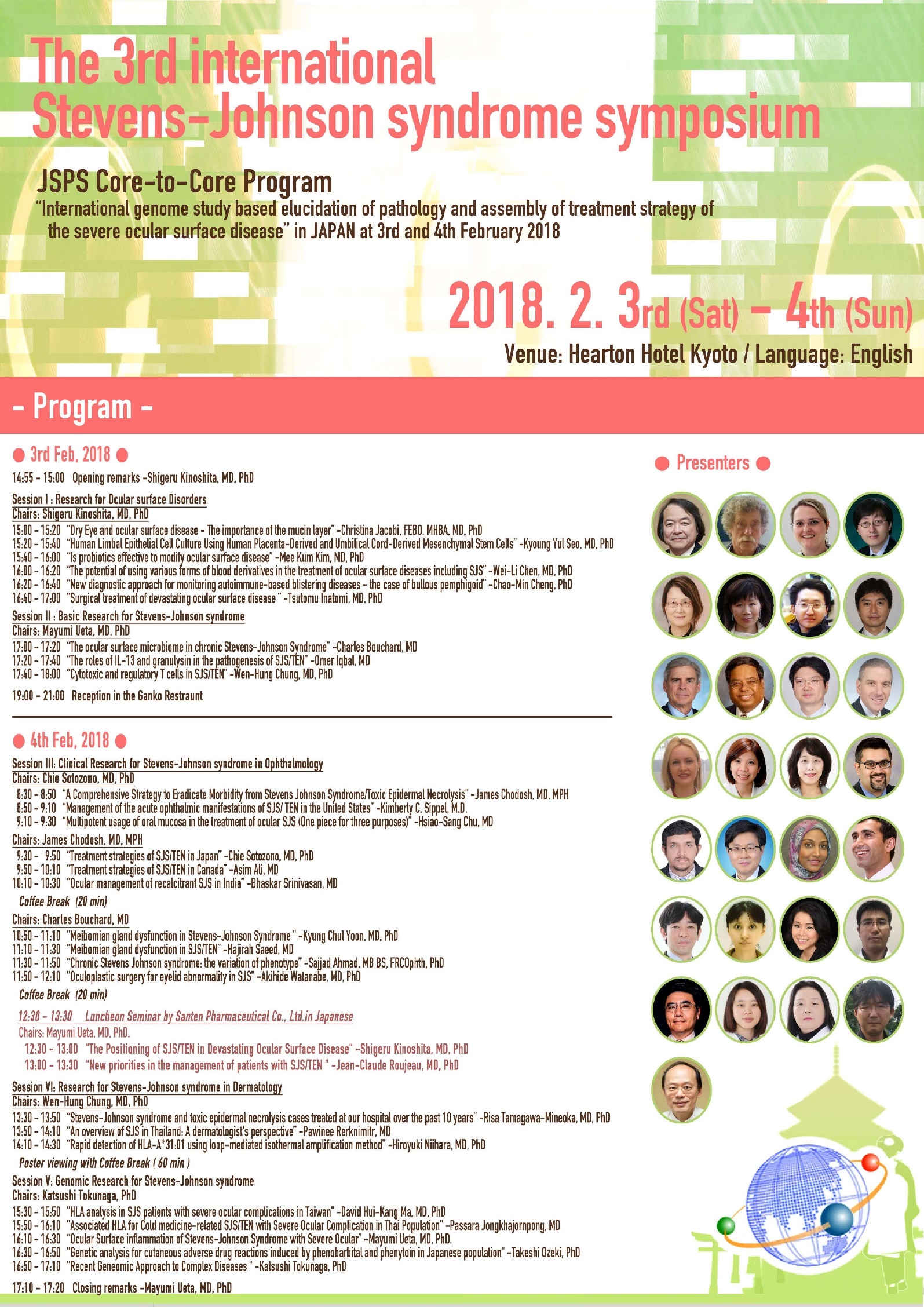 2018年2月3日(土曜日)から4日(日曜日)にかけて、ハートンホテル京都にて、Third International Stevens-Johnson Syndrome Symposium "International genome study based elucidation of pathology and assembly of treatment strategy of the severe ocular surface disease"を開催しました。