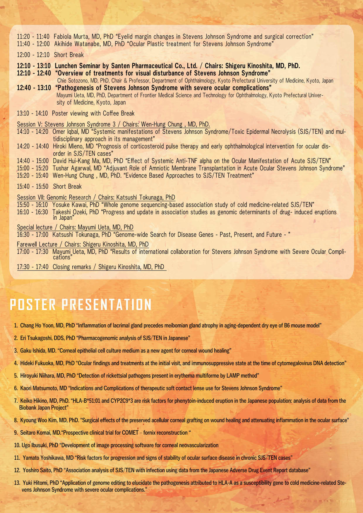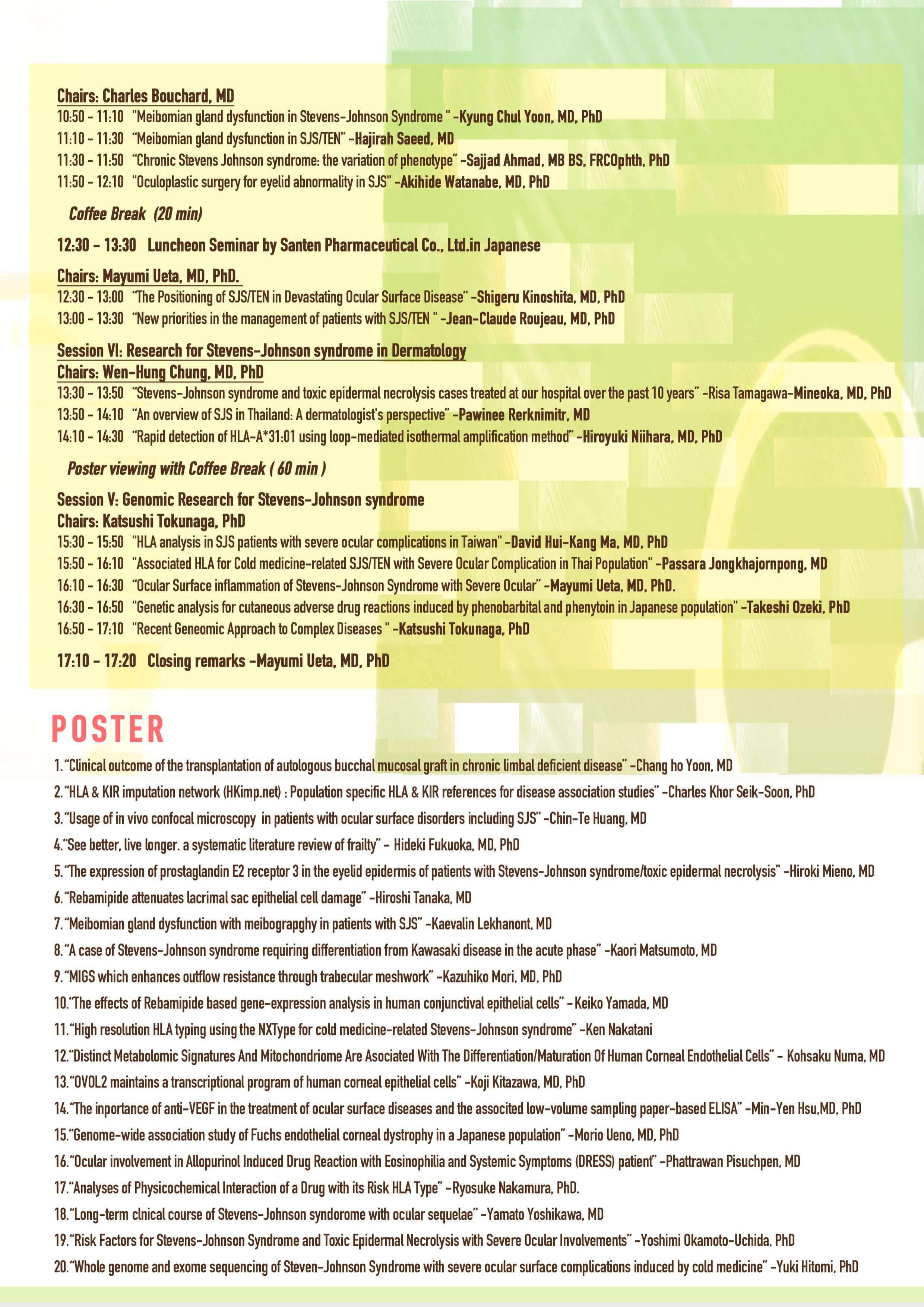 本シンポジウムには、米国、英国、カナダ、フランス、インド、韓国、台湾、タイなどの海外から35名を超える臨床医と研究者が集い、日本からは、多数の眼科臨床医、皮膚科臨床医、ゲノム研究者、ならびに、免疫学者が参加し、難治性眼疾患であるStevens-Johnson症候群の診断と治療の標準化、遺伝素因と疾患病態について発表ならびに討論を行いました。