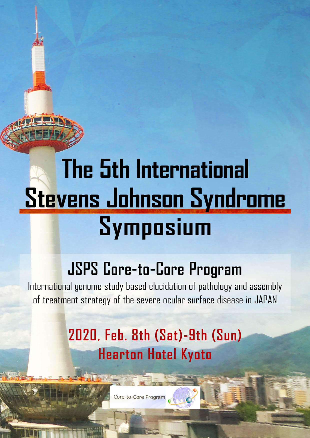 2020年2月8日(土曜日)から9日(日曜日)にかけて、ハートンホテル京都にて、The 5th International Stevens-Johnson Syndrome Symposium "International genome study based elucidation of pathology and assembly of treatment strategy of the severe ocular surface disease in JAPAN"が開催されました。本シンポジウムには、米国、英国、カナダ、インド、台湾、タイなどの海外から多くの臨床医と研究者が集い、日本からは、多数の眼科臨床医、皮膚科臨床医、ゲノム研究者、ならびに、免疫学者が参加し、難治性眼疾患であるStevens-Johnson症候群の診断と治療の標準化、遺伝素因と疾患病態について発表ならびに討論を行いました。