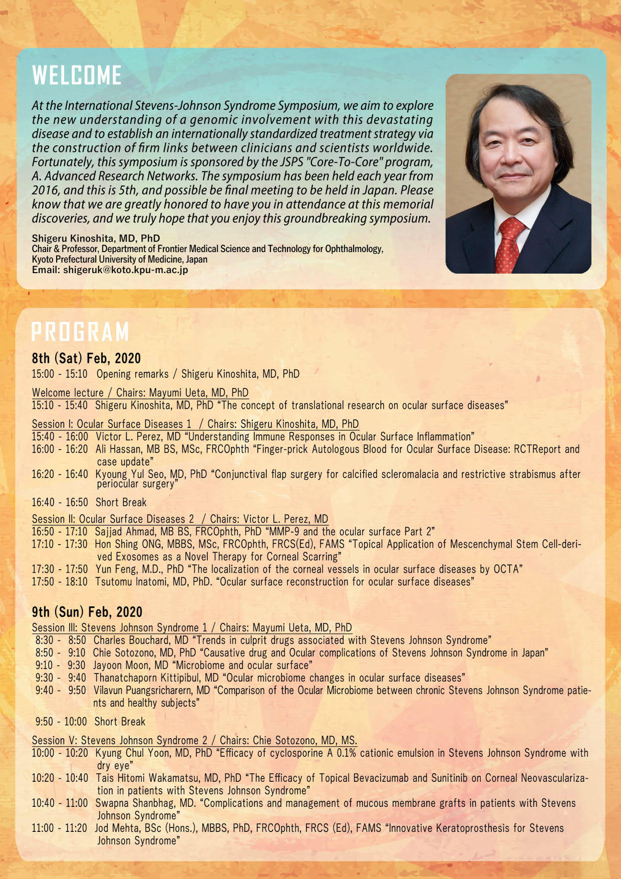 Stevens-Johnson症候群は、発症頻度は稀ながら、重篤な視力障害とともに眼後遺症を生じる疾患であり、日本のみならず国際的にも難治性眼表面疾患として憂慮されています。今回は、海外からは、米国、英国、韓国、台湾、タイなどの約20名の臨床医と研究者が集い、日本からは、共同研究者である第一線のゲノム研究者も参加し、Stevens-Johnson症候群の診断と治療の標準化、遺伝素因と疾患病態について発表ならびに討論を行います。今回、日本がまとめ役となって、Stevens-Johnson症候群についての国際共同研究シンポジウムを実施できることを大変に意義あることと捉え、日本学術振興会ならびに関係各位に感謝しております。
