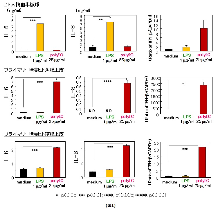 眼表面は粘膜組織の一つであり、ムチンなどを豊富に含んだ涙液でおおわれ、他の粘膜組織同様に、常在細菌も存在するが、腸管と同様に健常状態では炎症は生じていません。大変興味深いことに、粘膜上皮である眼表面上皮(角膜上皮、結膜上皮)細胞は、免疫担当細胞であるリンパ球やマクロファージとは異なった自然免疫機構を有し、容易に細菌などの菌体成分に対して炎症を惹起しない機構を保持しています(図1)。私達は、眼表面上皮細胞も炎症制御においては重要な役割を担っていると考えています。
