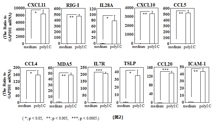 CXCL11, CCL20, CXCL10, CCL5, CCL4, IL28Aは、ウイルス感染で発現が上昇すると報告されている自然免疫関連遺伝子であるとともに、アレルギー関連遺伝子でもありました。MDA5,RIG-Iについては、TLR3と同様にウイルス由来2本鎖RNAを認識する細胞内の受容体であったことから、polyI:Cを介した炎症反応がTLR3だけではなく、MDA5やRIG-Iを介して生じている可能性が考えられます。