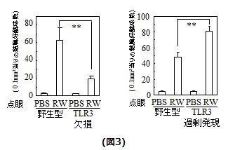 また、TLR3欠損マウス及びTLR3過剰発現マウスにアレルギー性結膜炎を誘発し、結膜好酸球浸潤について解析した結果、TLR3欠損マウスでは、抗原点眼24時間後の結膜好酸球浸潤が野生型マウスと比較して有意に減少し、TLR3過剰発現マウスでは、有意に増加しました(図3)。これらは、TLR3がアレルギー性結膜炎症を促進し、かつ、結膜上皮に発現しているTLR3がその炎症制御に大きく貢献していることを示していると考えられます。