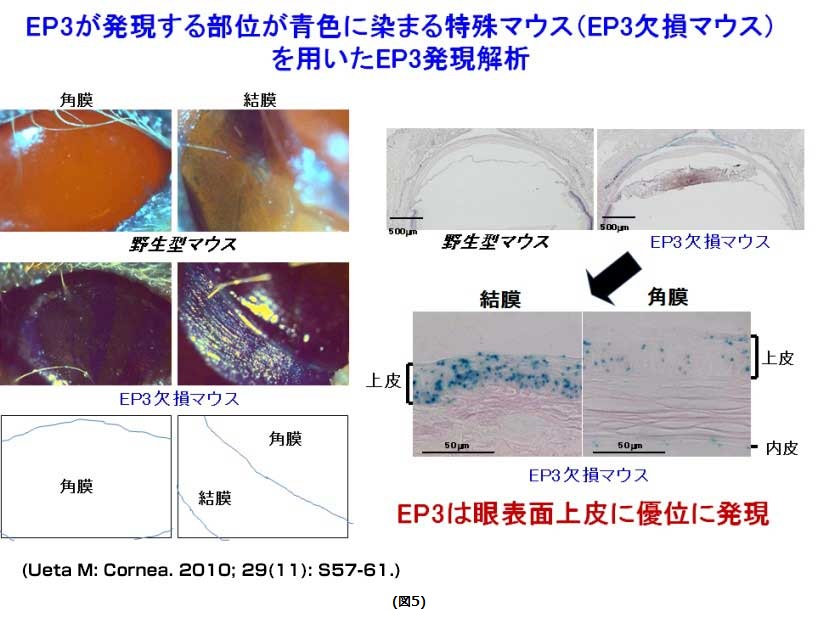一方、PGE2 はEP3を介してアレルギー性結膜炎を抑制していることも解明しました。EP3欠損マウスにアレルギー性結膜炎を誘発したところ、抗原点眼24時間後の結膜好酸球浸潤が野生型マウスと比較して有意に増加します(図4)。また、大変興味深いことに、EP3は炎症細胞ではなく、眼表面上皮(図5)、表皮、気管上皮などの上皮細胞に強く発現しています。