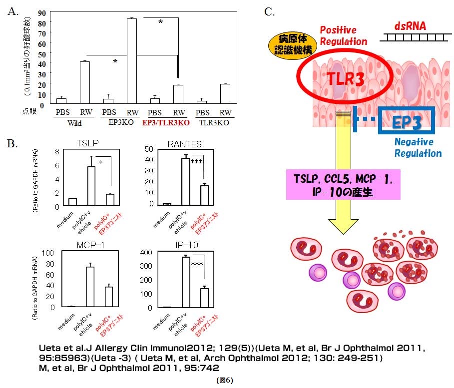上記のように、TLR3がアレルギー性結膜好酸球浸潤を促進し、EP3がアレルギー性結膜好酸球浸潤を抑制しているということから、我々はTLR3を介したアレルギー炎症促進作用をEP3が抑制する可能性を考えました。そこで,TLR3/EP3二重欠損マウスを作製し,両分子の相互作用について検討した結果、TLR3/EP3二重欠損マウスではアレルギー性結膜好酸球浸潤が抑制される結果となりました(図6A)。また、TLR3を介して結膜上皮から誘導される各種サイトカインをEP3アゴニストが抑制する(図6B)ことより、各種サイトカインの産生をEP3が抑制することによりアレルギー炎症が抑制されている可能性が示されました(図6C)。