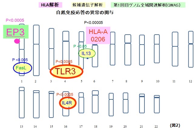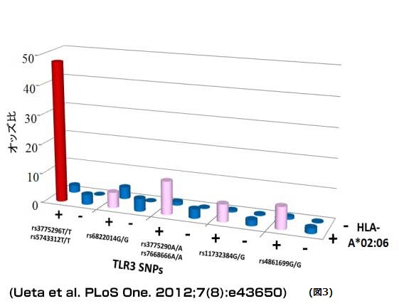 また、候補遺伝子アプローチによる遺伝子多型解析では、このIL-4R、ならびに、TLR3 (Toll like receptor 3: ウイルス由来の二本鎖RNAの受容体)やその他複数の遺伝子多型との有意な関連が確認されました(図2)。さらに、驚くことに、HLA-A*02:06とTLR3 rs3775296T/Tの両方を持つとオッズ比は、47.7にまで上昇することから(図3)、複数の遺伝子多型の組み合わせがこの疾患の発症に大きく貢献している可能性が示唆されました。