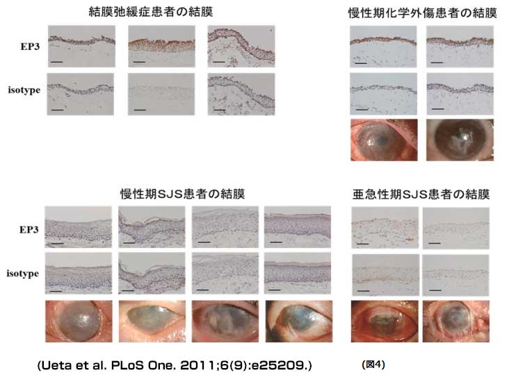 全ゲノム関連解析では、プロスタグランジン(PG)E2の受容体の一つであるEP3の遺伝子PTGER3の遺伝子多型との関連が確認されました。大変興味深いことに重篤な眼合併症を伴うStevens-Johnson症候群患者の眼表面組織では、このEP3タンパクの発現が著明に減少していました(図4)。