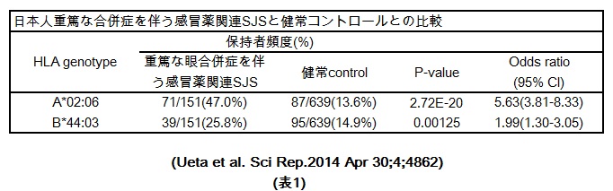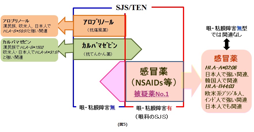 抗痛風薬であるアロプリールにより発症したSJS/TENや、抗てんかん薬であるカルバマゼピンにより発症したSJS/TENの発症に関連するHLA型については、他の多数のグループから報告されています。しかし、感冒薬に関連した発症したStevens-Johnson症候群の発症に関与する遺伝素因について発表しているのは、上田ら京都府立医科大学のグループが世界で初めてです(図5)。