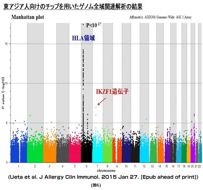さらに、感冒薬に絞って重篤な眼合併症を伴うStevens-Johnson症候群を対象に、アジア人向けのGeneChipを用いた全ゲノム領域の関連解析を行ったところ、HLA領域以外に、IKZF1遺伝子が強い関連を示しました(図6)。このIKZF1遺伝子多型は、日本人のみならず、韓国人、インド人でも有意な関連を認めたことから感冒薬関連Stevens-Johnson症候群(重篤な眼合併症型)の国際的共通の疾患関連遺伝子であると考えられます。